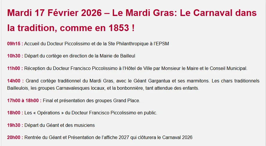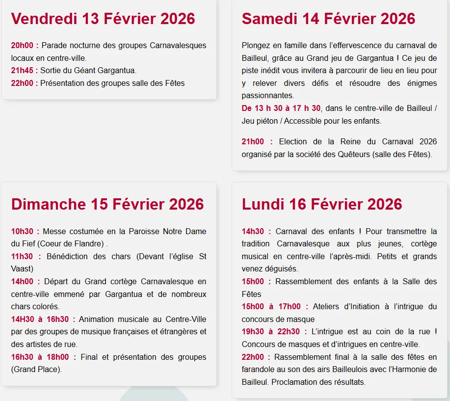 --> Programme complet et détaillé : http://carnaval-de-bailleul.fr/wp-content/uploads/2026/02/Officiel-Public-Programme-2026-.pdf