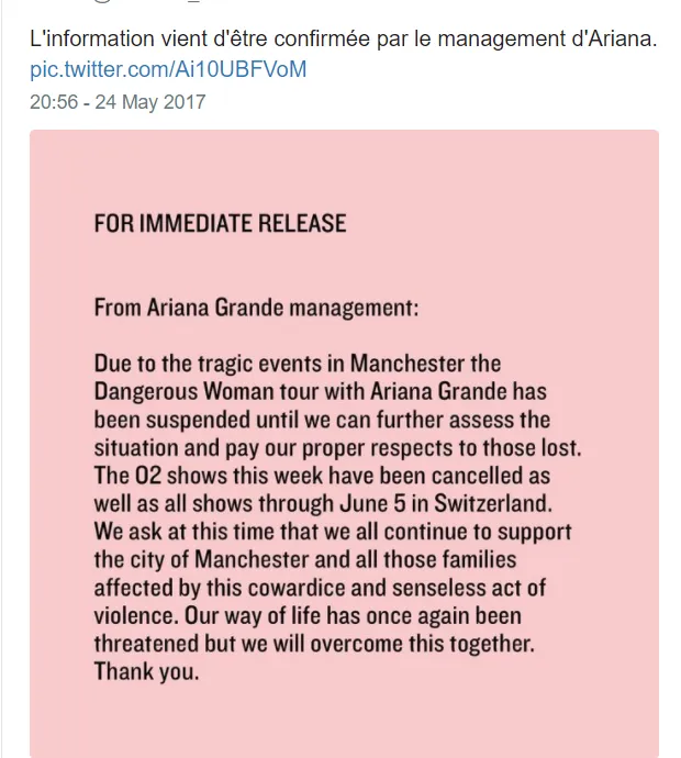 En intitulant sa série de concerts "Dangerous woman Tour, la pauvre Ariana Grande n'imaginait pas être tristement prophétique. Une image détournée de l'illustration de la tournée, un ruban noir sur fond rose, fait le buzz sur les réseaux sociaux. Nul doute d'ailleurs que la tournée de la "Femme dangereuse" devra changer de nom si elle doit reprendre la route.