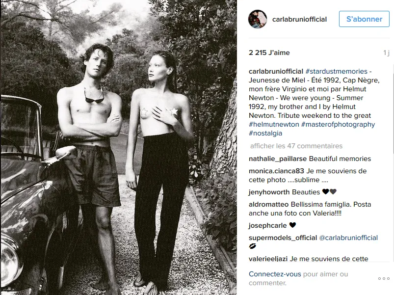 Et quelques clichés plus tard, Carla Bruni-Sarkozy enflamme déjà la toile en publiant, ce dimanche 3 juillet, une photo d'elle seins nus. Mais rien de vulgaire là-dedans. Sur ce cliché en noir et blanc qui fleure bon la nostalgie, la sœur de la réalisatrice Valéria Bruni-Tedeschi prend la pose aux côtés de son frère Virginio au Cap Nègre. Elle profite donc de ce biais pour rendre hommage à son frère mort du SIDA en 2006, mais aussi au photographe australien d'origine allemande Helmut Newton, auteur de cette photographie.