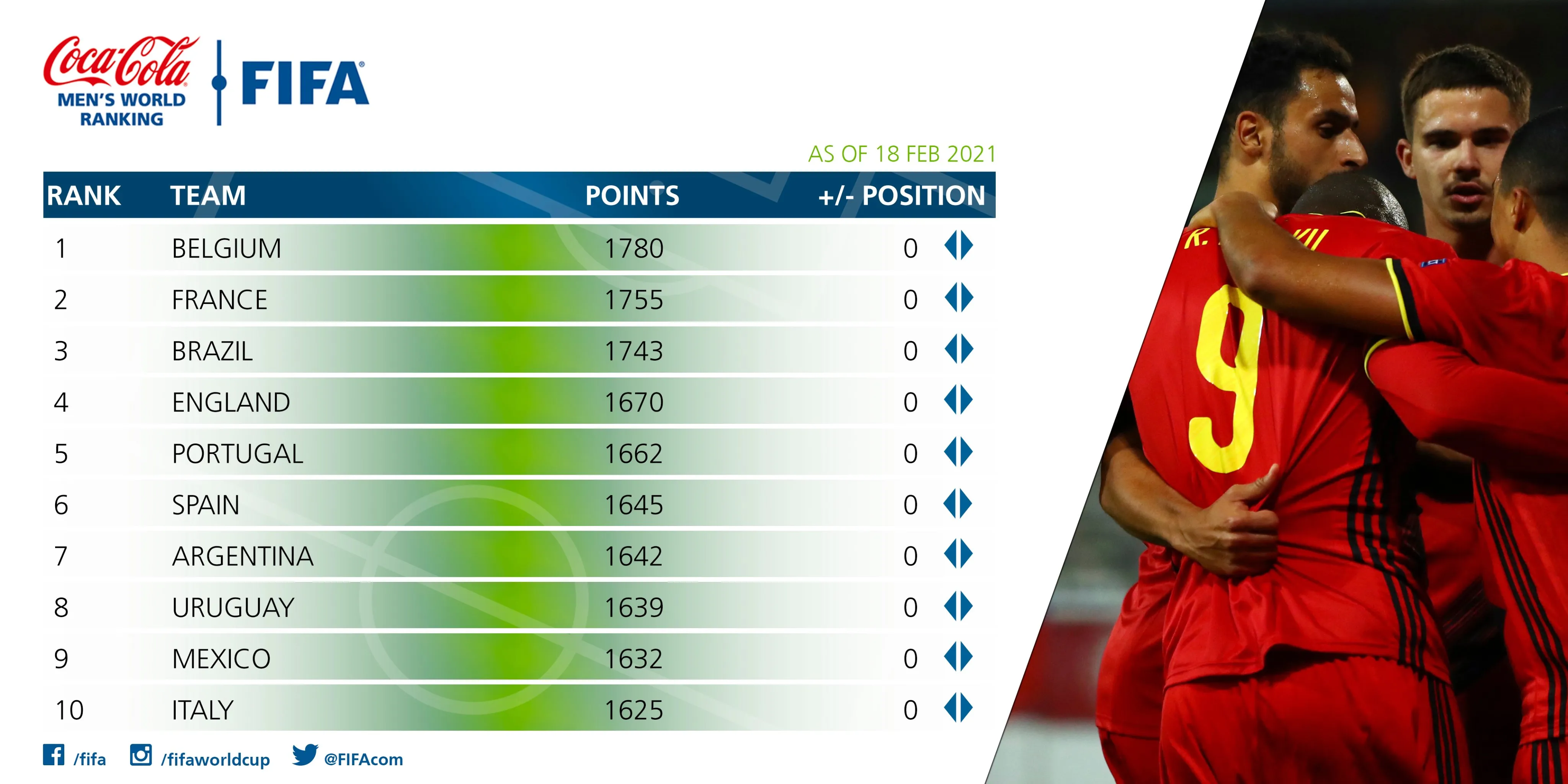 La Belgique est toujours en tête d'un premier classement FIFA 2021 en grande partie inchangé. Les Diables Rouges devancent toujours de quelques points la France et le Brésil.