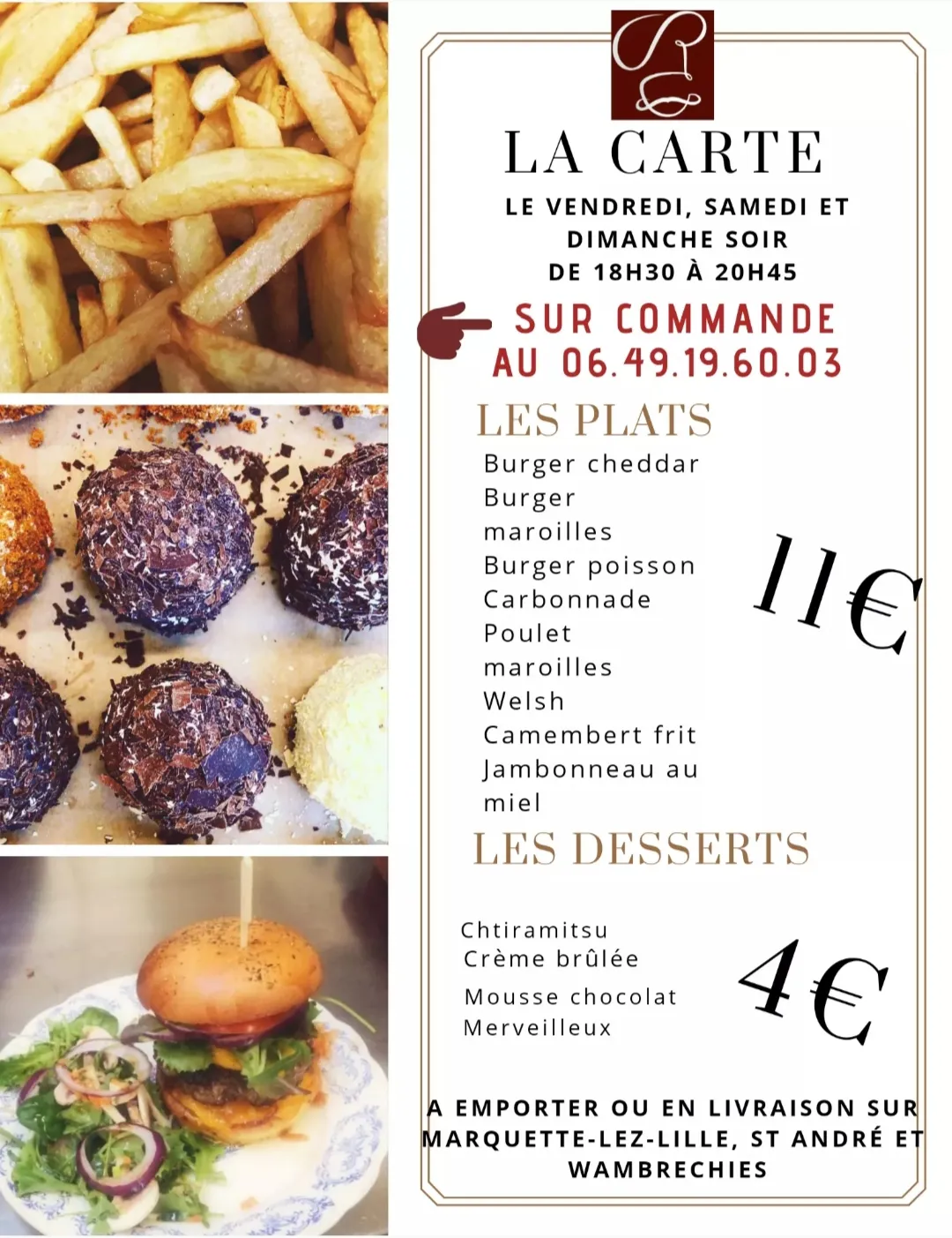 Vente à emporter vendredi soir, samedi soir et dimanche soir.