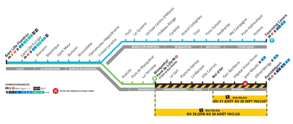 Des bus relais remplacent donc le tramway sur l'itinéraire de la ligne R durant cette période. Ils circuleront à la même fréquence et à la même amplitude que le tramway. Afin de faciliter les déplacements, les correspondances entre le bus et le tramway seront organisées. Des agents ilévia seront présents pour accompagner les voyageurs. Attention, les conducteurs des bus relais ne vendront pas de titre de transport.