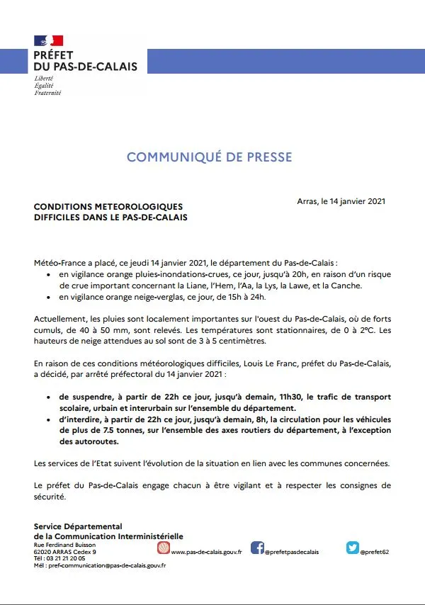 #vigilance En raison des conditions météorologiques difficiles, monsieur le @Prefet62 a décidé de prendre des restrictions de circulation des transports scolaires urbains et inter-urbains ainsi que la circulation des + de 7,5t.