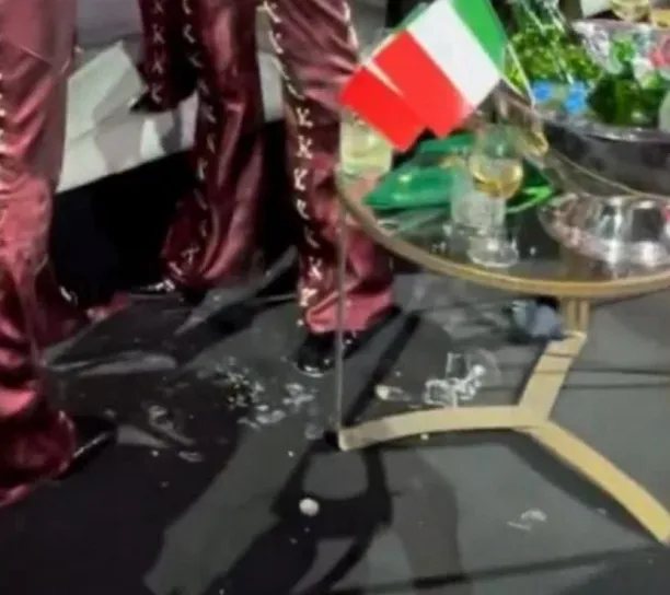 L'UER peut confirmer que du verre brisé a été trouvé après une vérification sur place. Nous examinons toujours attentivement les images et nous mettrons à jour de plus amples informations en temps voulu. De même, cette photo qui circule montre clairement des morceaux de verres sont présents sous la table :
