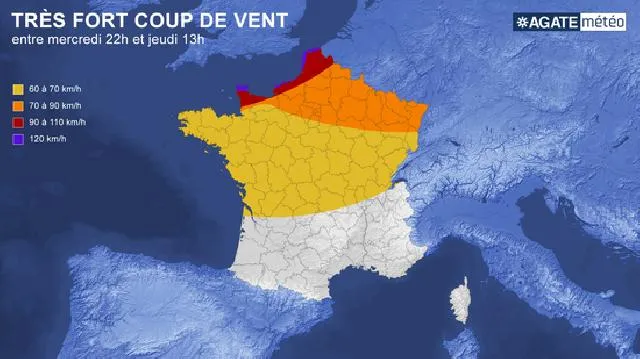 Entre mercredi soir et jeudi matin, il faudra surveiller un très fort coup de vent sur la moitié Nord du pays avec des rafales comprises entre 90 et 120km/h des côtes bretonnes jusqu'aux littoraux du Nord-Pas-de-Calais, 70 à 90km/h de la Picardie aux Ardennes, autour de 70km/h des Pays de la Loire aux frontières de l'Est. On s'oriente vers un fort coup de vent assez classique en cette période de l'année. Les rafales sont revues à la baisse, étant donné que la dépression est modélisée beaucoup plus au Nord. En revanche, on attend une forte tempête sur le Royaume-Uni.