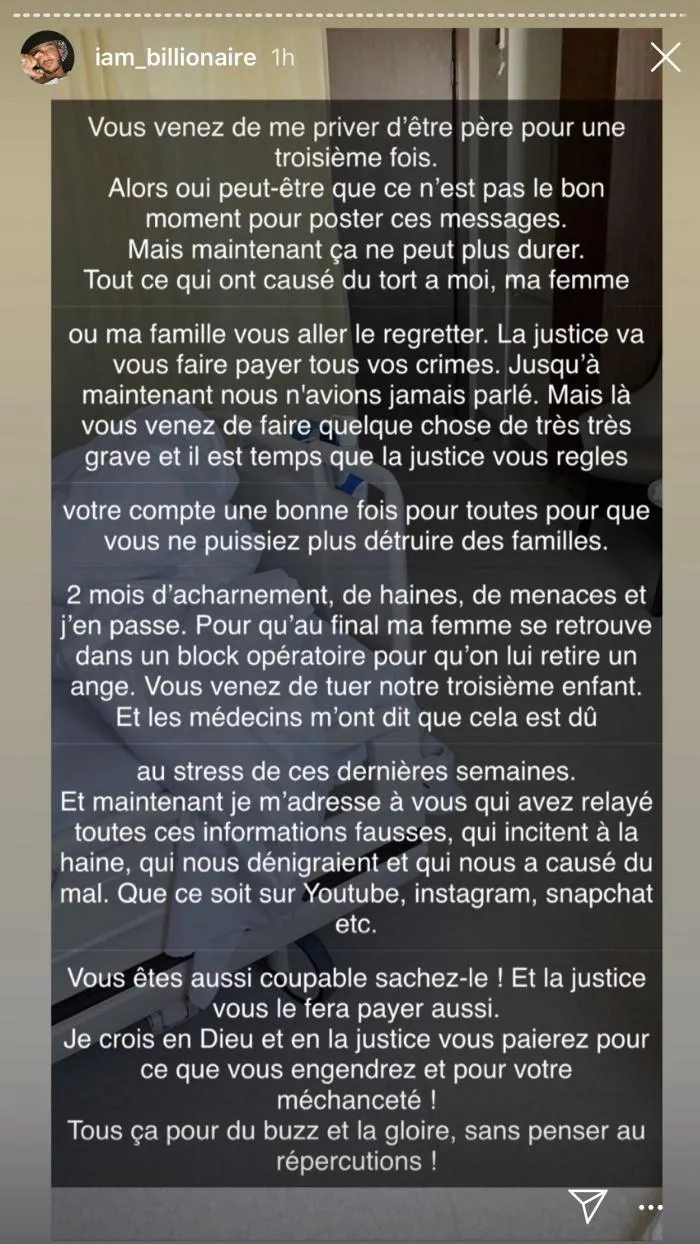 Laurent visiblement hors de lui ne s'arrête pas là. "Deux mois d'acharnement, de haine, de menaces et j'en passe. Pour qu'au final ma femme se retrouve dans un bloc opératoire pour lui retirer un ange. Vous venez de tuer notre troisième enfant. Les médecins m'ont dit que cela est dû au stress de ces dernières semaines". Dans ces très difficiles moments, nous souhaitons un prompt rétablissement à Jazz.