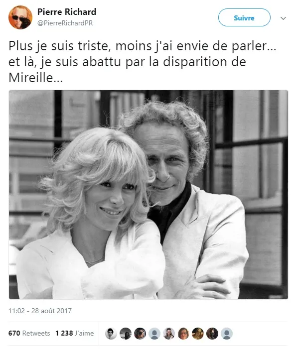 L'emouvant message de Pierre Richard sur la disparition de Mireille Darc