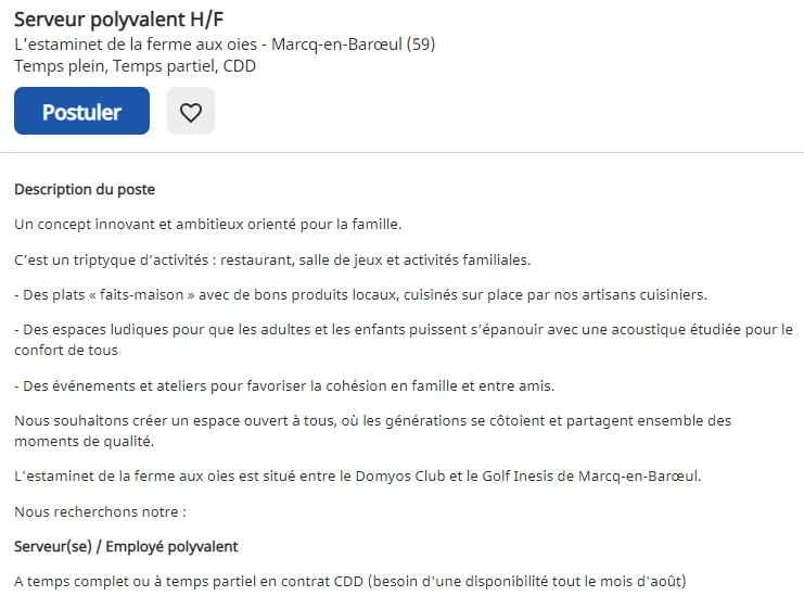 L'Estaminet de la Ferme Aux Oies situé entre le Domyos Club et le Golf Inesis de Marcq-en-Barœul recherche un(e) Serveur(-se) / Employé(e) polyvalent(e) à temps complet ou à temps partiel en CDD (besoin d'une disponibilité tout le mois d'août).
