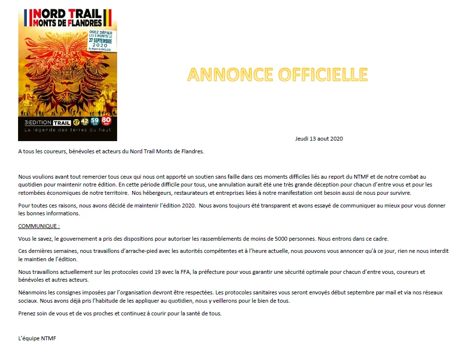 La 3e édition du Nord Trail Monts de Flandres maintenue le 27 Septembre prochain.