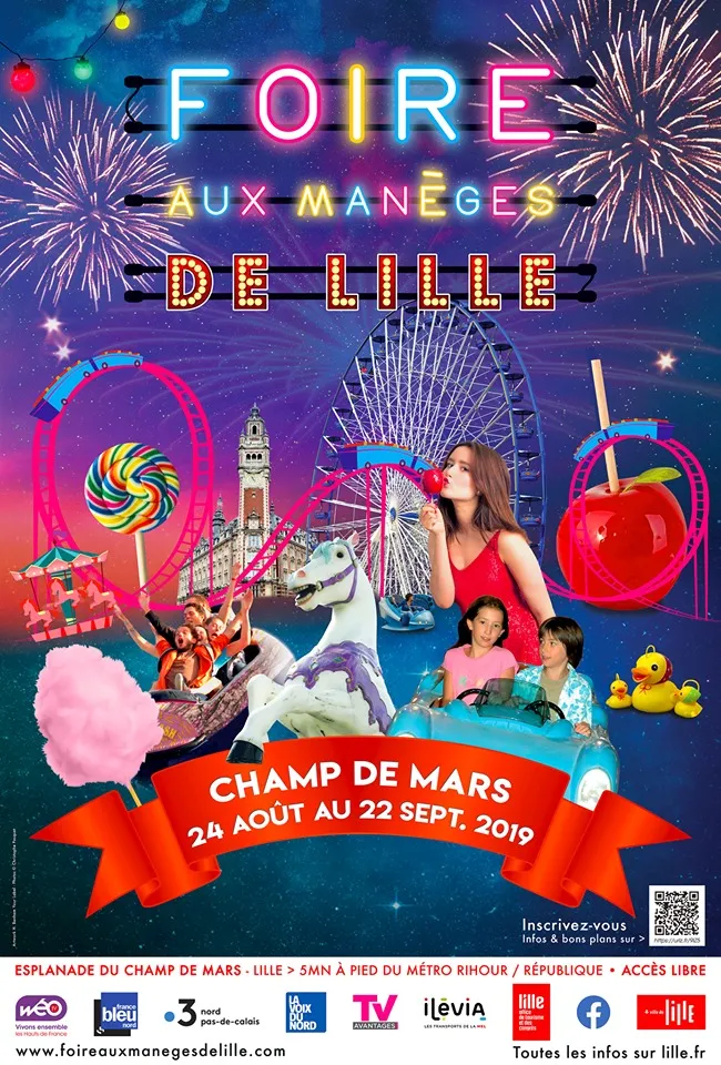 Et voici en exclusivité la nouvelle affiche officielle de la Foire aux Manèges de Lille 2019. Rendez-vous les Ami(e)s le Samedi 24 Août prochain sur l'Esplanade du Champ de Mars à Lille pour une belle journée festive. Ouverture à 14h00, inauguration à 15h30, animations diverses, super promotion 1 tour de manège acheté = 1 tour de manège OFFERT à l'occasion de l'ouverture et en début de soirée vers 22h30 dans ce dédale de manèges, de peluches et de gourmandises un grand Feu d'Artifice pour donner le coup d'envoi de cette édition 2019. Un évènement incontournable de la rentrée dans Hauts-de-France qu'il ne faut surtout pas manquer !