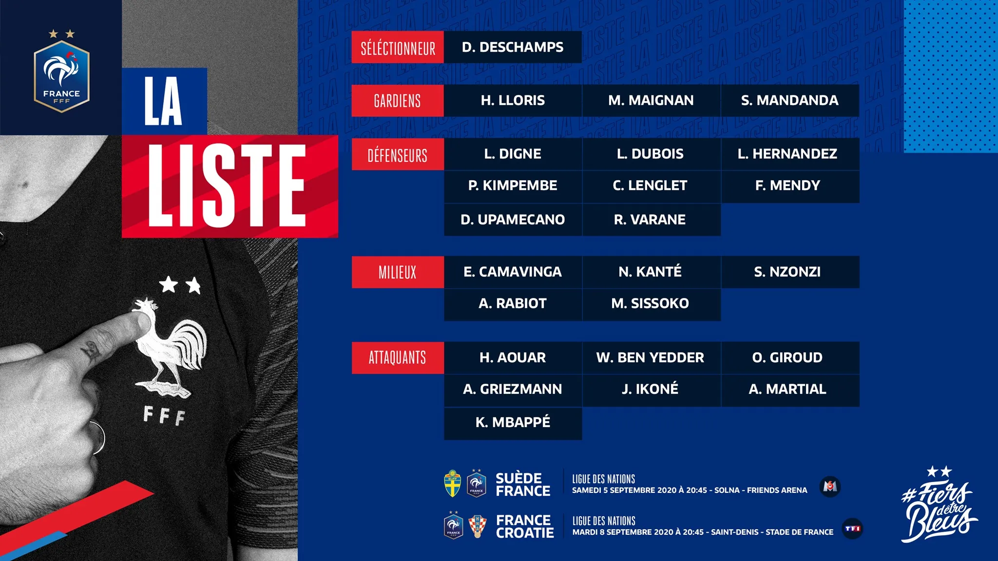 Didier Deschamps, sélectionneur de l’Équipe de France, a communiqué au siège de la FFF, la liste des joueurs retenus pour Suède-France (samedi 5 septembre, 20h45 à Solna, en direct sur M6) et France-Croatie (mardi 8 septembre, 20h45 au Stade de France, en direct sur TF1). Ces deux rencontres s'inscrivent dans le cadre de la Ligue des Nations de l’UEFA.