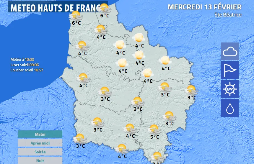 Les gelées seront au rendez-vous le matin sur le Valenciennois et l’Avesnois. Sur la région, entre -1 et 3 degrés sont attendus au petit matin. Les maximales, douces par rapport aux normales de saison, varieront de 6 à 9 degrés l'après-midi avec 6 degrés à Maubeuge (Bavay et Ramoussies), 7 degrés à Valenciennes (Raismes et Sommaing), à Cambrai (Marquion et Lesdain), St Pol (Planques et Humières) et Arras (St Laurent Blangy et Ligny Tilloy), Lens (Grenay et Essars), 8 degrés sur Lille (Comines et Halluin), sur St Omer (Clairmarais et Bavinchove), et 9 degrés sur Calais (Audruicq et St Inglevert), sur Boulogne (Maresville et Alucthun), et Dunkerque (Oye Plage et Wyde).