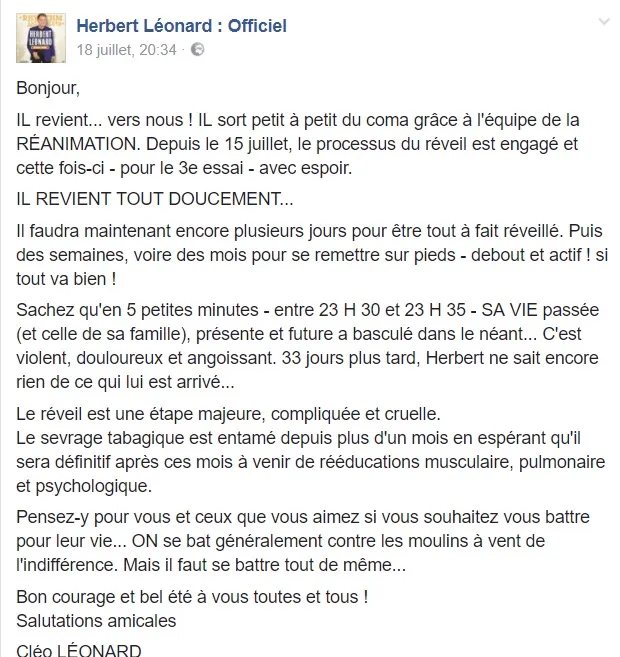 L'interprète du tube "Pour le plaisir" est engagé dans "le processus de réveil" depuis le 15 juillet, " une étape majeure, compliquée, et cruelle", explique Cléo Léonard sur Facebook. Rien n'est encore gagné et cette période pourrait prendre des semaines voire des mois.