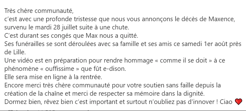 Le youtubeur Maxence Cappelle alias « e-dison » est mort