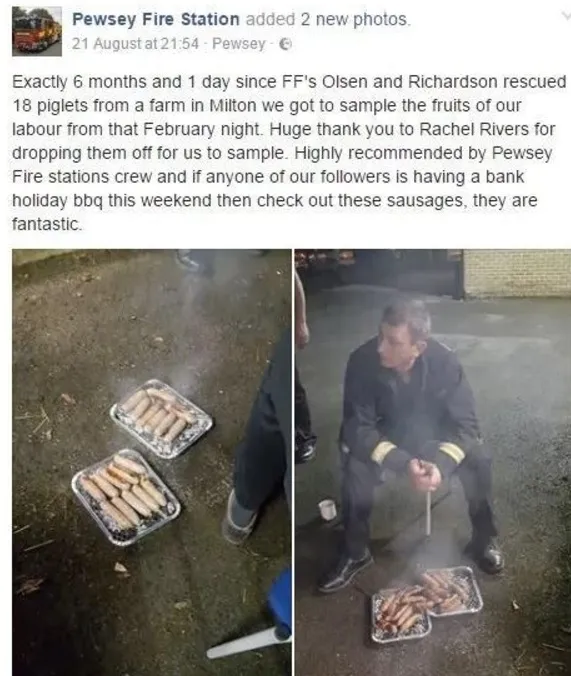 Sur Facebook, les pompiers ont qualifié cette attention de "fantastique" avant d'être confrontés à un flot de critiques : "Tout juste six mois et un jour après que les pompiers eurent sauvé 18 porcelets d'un feu, nous avons pu goûter le fruit de nos efforts de cette nuit de février. Un grand merci à Rachel Rivers (...) si certains de nos abonnés font un barbecue pour le long week-end, cherchez ces saucisses, elles sont fantastiques", pouvait-on lire.