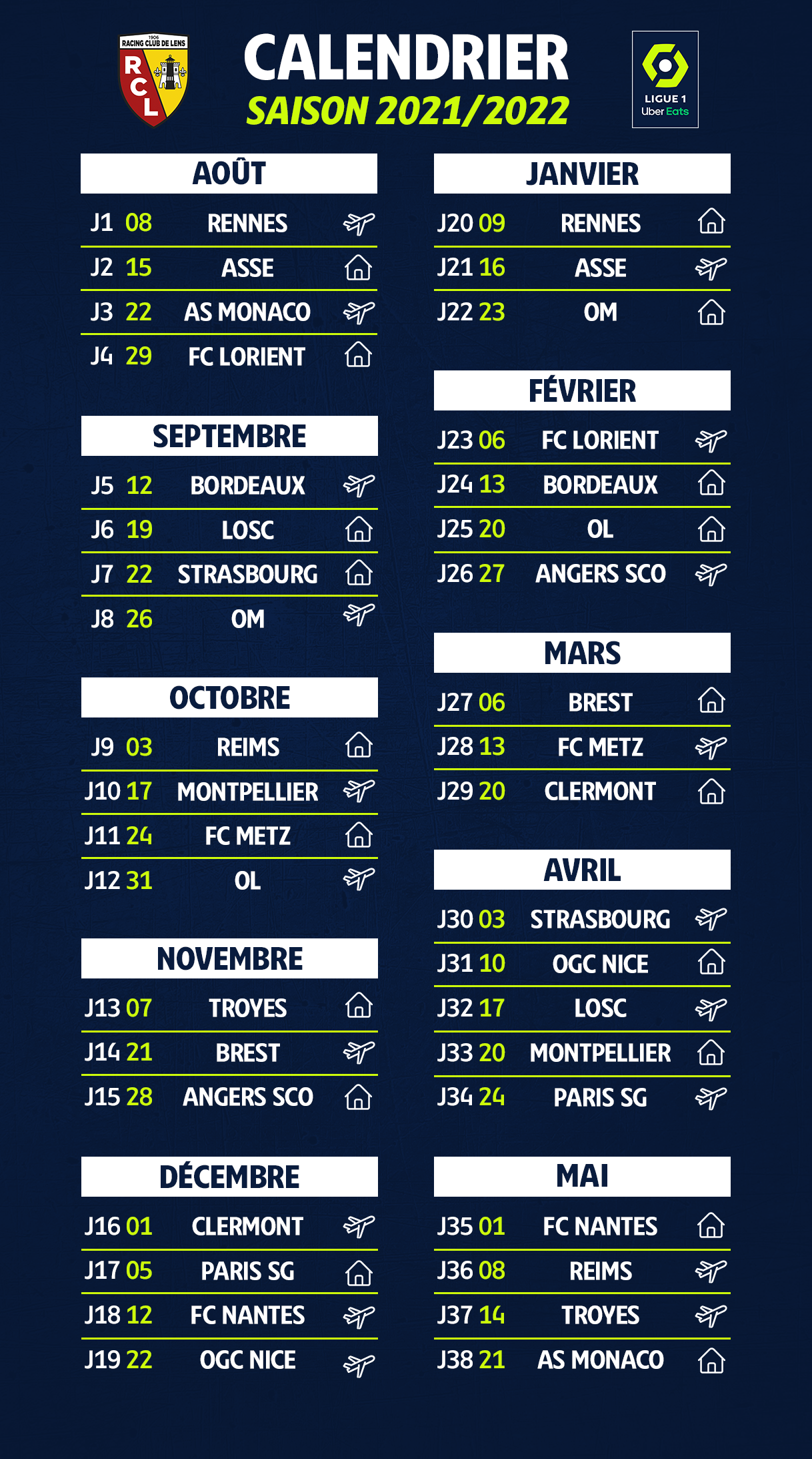 Ligue 1 : Le calendrier du RC LENS pour la saison 2021/2022