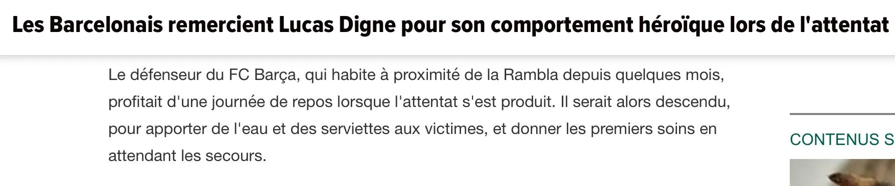 Résidant place de la Catalogne, à côté des Ramblas où a été perpétré l'attentat du 17 août dernier à Barcelone, Lucas Digne a vécu au plus près la tragédie qui a tué 14 personnes et blessé plus de 120 piétons. Le défenseur du Barça a même apporté son aide aux victimes en attendant l'arrivée des secours, affirme le Mundo Deportivo.