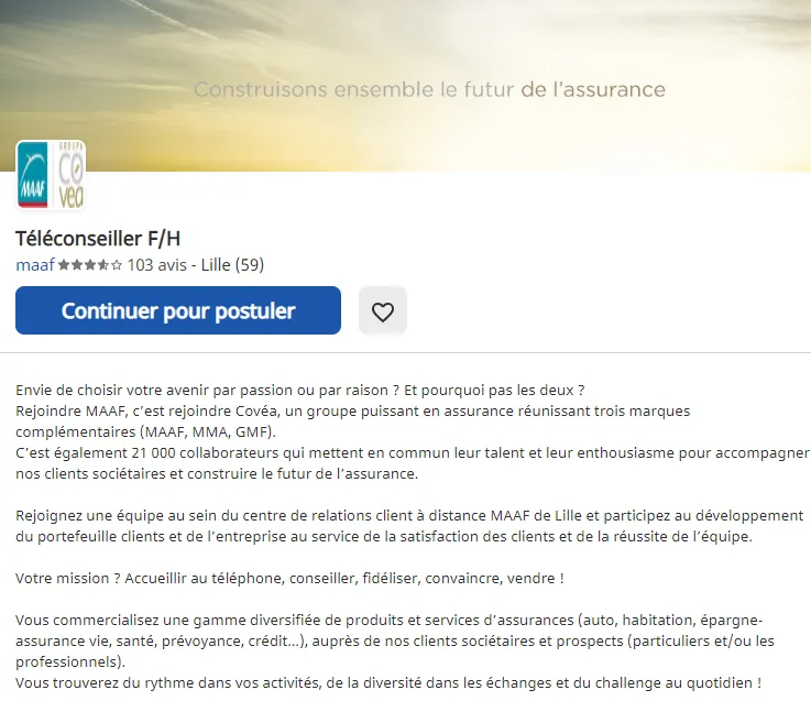 Les assurances MAAF à Lille recrutent Téléconseiller (H/F). Vous commercialisez une gamme diversifiée de produits et services d’assurances auprès des clients sociétaires et prospects.