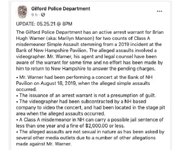 La police de Gilford (Etats-Unis) annonce qu'un mandat d'arrêt a été émis contre Brian Hugh Warner, plus connu sous le nom de Marilyn Manson. Selon les autorités, ce mandat a été lancé pour " deux chefs d'accusation d'agression simple". Les faits sont survenus en 2019 au Bank of New Hampshire Pavilion lors d'un concert de l'artiste et implique un caméraman.
