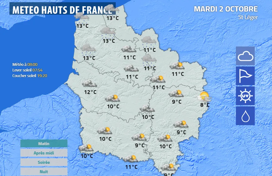Les températures afficheront entre 3 et 8°C le matin et atteindront 12 à 17°C l'après-midi avec: 12°C pour Fourmies, 13°C sur Cambrai, Valenciennes ou bien encore Douai, 14°C à Lens et Arras, 15°C en direction de Lille ou Auchel, 16°C à Berck et jusqu'à 17°C sur Calais.