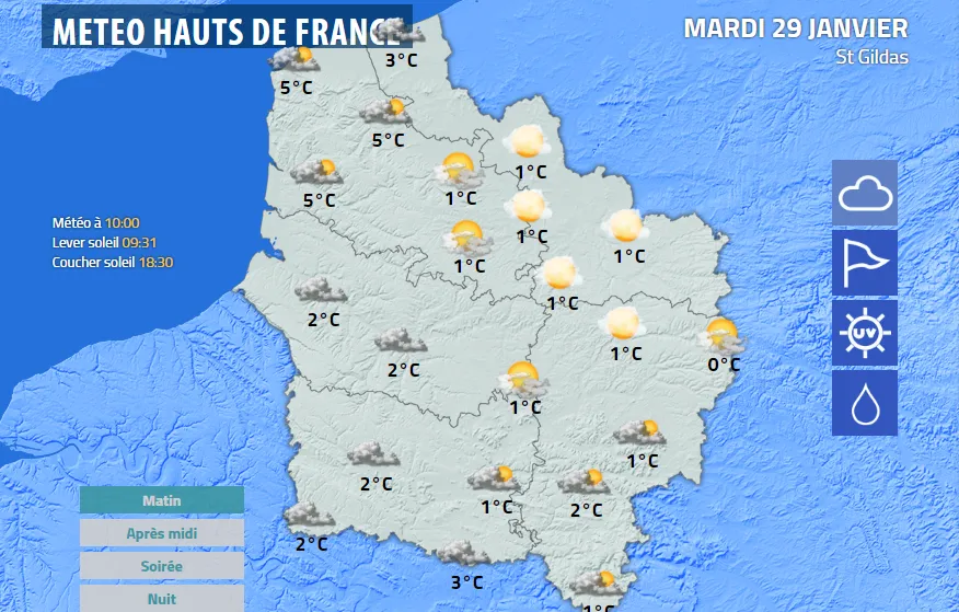 Les températures minimales seront comprises entre -1 et 0°C (intérieur/littoral) et varieront de 2 à 5°C l'après-midi avec 2°C sur Valenciennes(Odomez et Abscon), 5°C sur Calais(Ardres et Guemps), Boulogne(Samer et Wimereux), 4°C sur Saint Omer(Cléty et Rombly), Saint Pol(Framecourt et Willeman), Lens(Festubert et Olhain), Arras(Dainville et Estrun), 3°C sur Maubeuge(Bavay et Trélon) et 5°C sur Dunkerque(Killem et Uxem), 3°C sur Lille(Fromelles et Ronchin) et Cambrai(Annoeux et Clary). 4°C sur Abbeville et Menin.