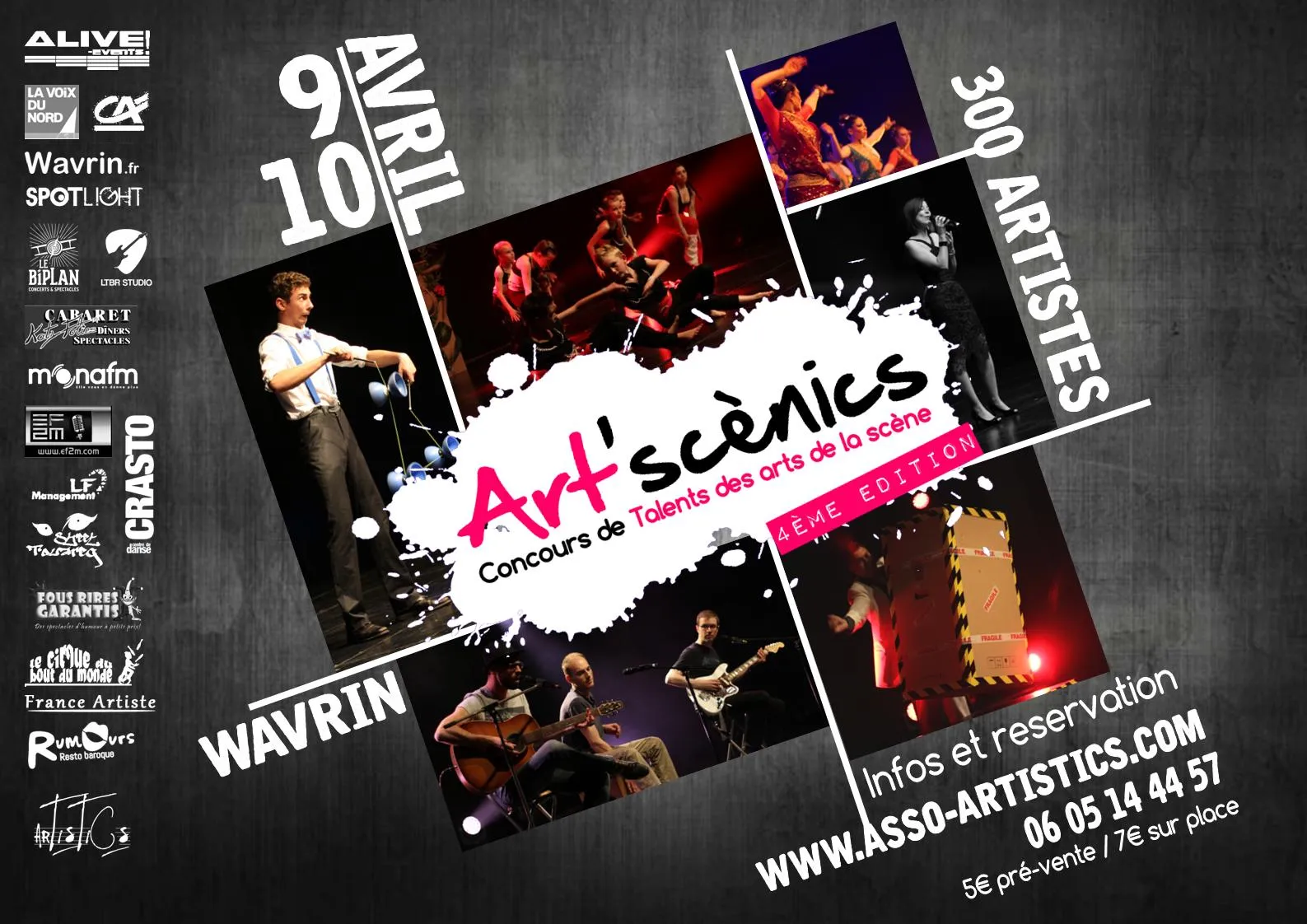 Les samedi 9 et dimanche 10 Avril à la salle Polyvalente de Wavrin, découvrez un peu plus de 300 artistes venus de toute la France. Art'scènics est le seul événément majeur de la région où se cotoient l'ensemble des Arts de la scène.