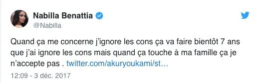Des paroles qui ont fortement agacé la jeune femme qui a décidé de répondre au chroniqueurs. Sur Twitter, elle lance: "Quand ça me concerne j’ignore les cons ça va faire bientôt 7 ans que j’ai ignore les cons mais quand ça touche à ma famille ça je n’accepte pas . .