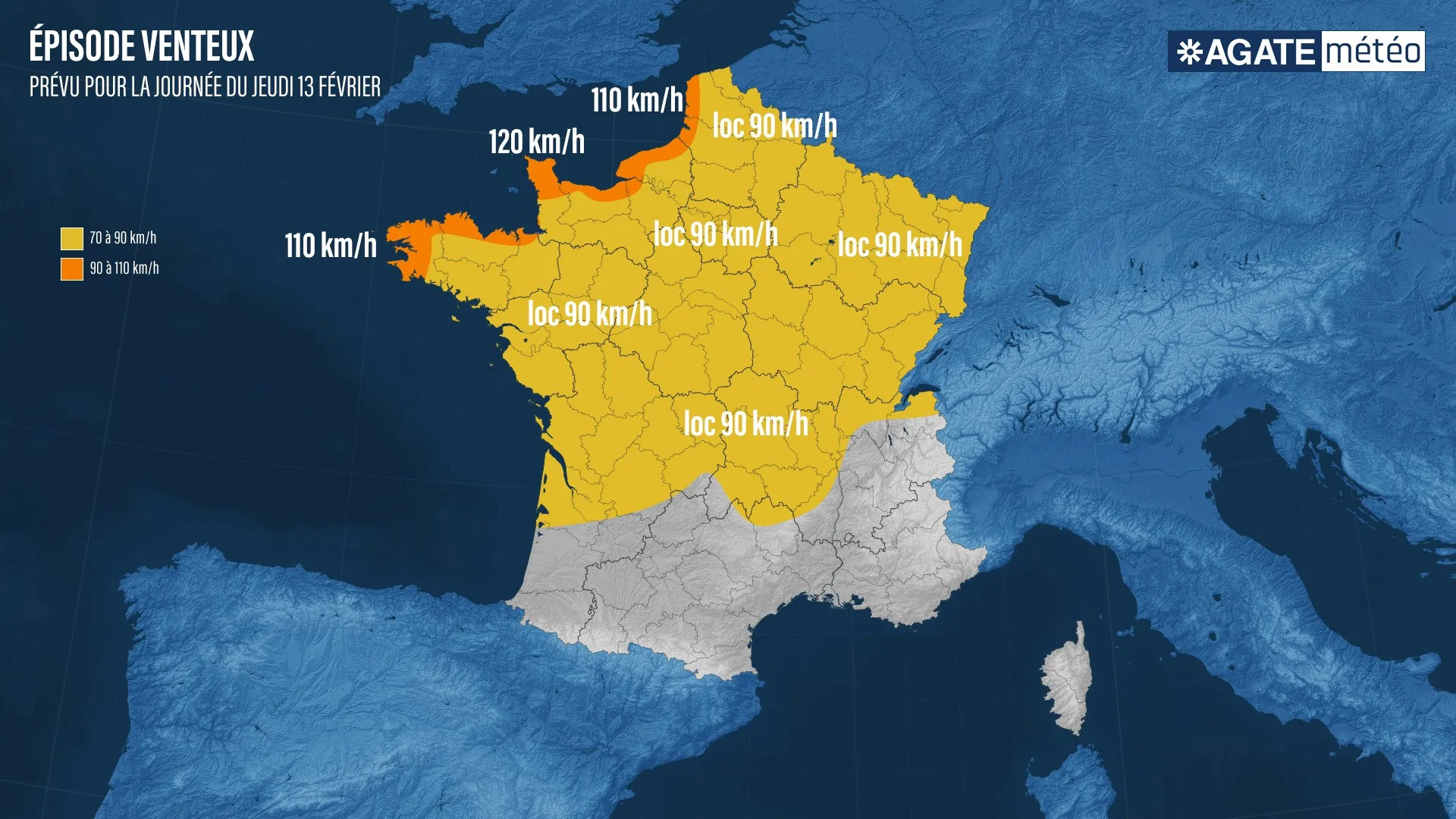Un coup de vent est attendu dans la nuit de mercredi et jeudi sur la Bretagne et la Normandie avec des rafales comprises entre 70 et 80km/h dans les terres, 90 à 110km/h sur les côtes, ponctuellement 120km/h sur le Nord Cotentin. Ces vents forts progresseront en cours d’après-midi du Poitou-Charentes au Grand-Est avec des bourrasques autour de 80km/h dans les terres. A l'arrière du front froid, nous attendons des averses qui pourront prendre un caractère orageux et s'accompagner de grésil. Sous orages, les bourrasques pourront atteindre les seuils des 90km/h y compris dans les terres. Sur les côtes de la Manche, les rafales estimées sont de l’ordre de 90 à 110km/h. L’amélioration interviendra en soirée avec l’éloignement de la dépression en direction du Benelux.