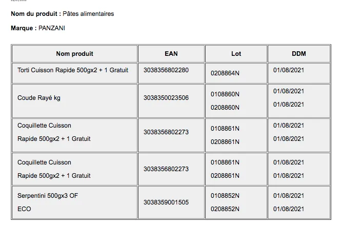 rappel de pâtes Panzani et d'oeufs Les Poulettes Risque d'intoxication