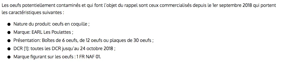 "Les autorités sanitaires recommandent aux personnes qui détiennent encore ces oeufs de ne pas les consommer et de consulter un médecin en cas de signes de gastro-entérite (diarrhée, vomissements, souvent accompagnés de fièvre...) survenant après la consommation de ces produits", prévient le ministère de l'Agriculture.