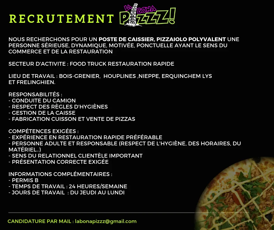 RECHERCHE EMPLOI :Pizzaïolo / Pizzaïola LA BONA PIZZZ - 59 - NIEPPE/ERQUINGHEM/HOUPLINES/