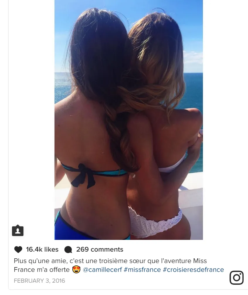 Comme sur cette publication où les deux jeunes femmes, habillées d'un maillot de bain, étaient dans les bras l'une de l'autre. En légende, Iris Mittenaere expliquait pourtant bien sa relation avec Camille Cerf : « Plus qu'une amie, c'est une troisième sœur que l'aventure Miss France m'a offerte ». Il est bien question d'amour… mais seulement fraternel.