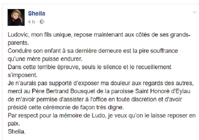 Sheila obligé de poster encore sur son facebook parce que certains medias se posaient la question de sa présence aux obsèques de son fils