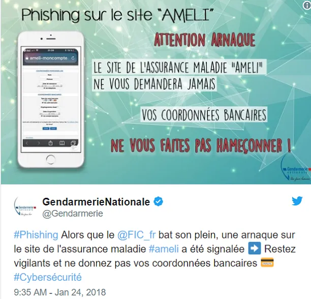 La gendarmerie a émis ce mercredi 24 janvier un appel à la vigilance sur Twitter. Des pirates informatiques ont en effet lancé une vaste campagne de "phishing" en se faisant passer pour l’Assurance maladie, dans le but de récupérer vos informations bancaires.