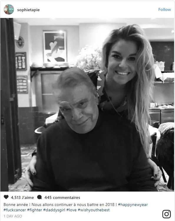 Sophie Tapie a publié un portrait d'elle accompagnée de son père sur Instagram. Sa fille l'enlace sur le cliché et affirme en légende qu'ils vont "continuer à se battre pour 2018". Un message complété des hashtags "bonne année", "cancer, on t'emm****" et "battant".