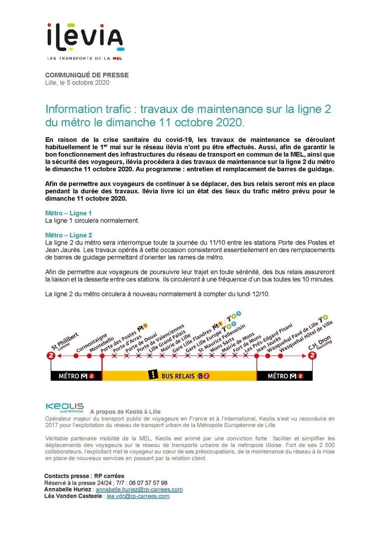 Travaux de maintenance sur la ligne 2 du métro le dimanche 11 octobre 2020 :