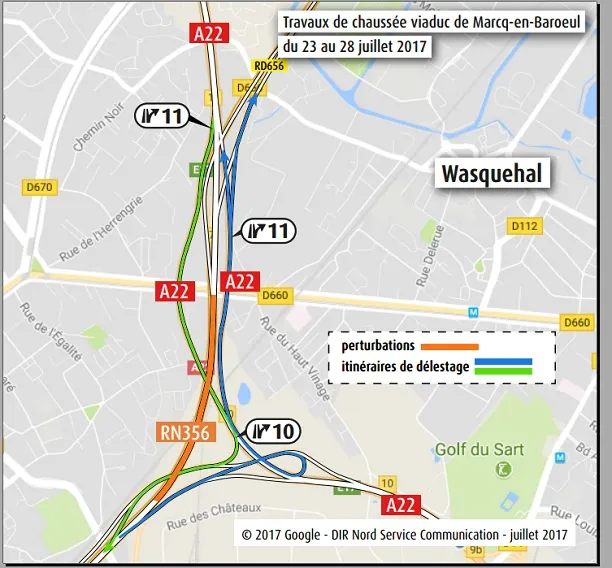 A partir du dimanche 23 juillet à 21h00 au vendredi 28 juillet à 19h00, de jour comme de nuit, des travaux de chaussée seront réalisés sur la RN356, au niveau du viaduc de Marcq-en-Baroeul.