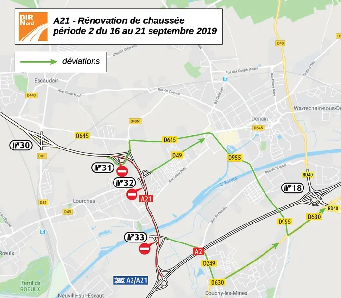 fermeture totale de l’A21 au niveau de l’échangeur n°31 (Denain) dont les voies seront