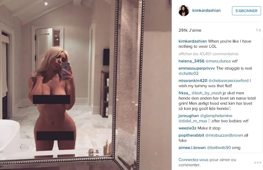 Pour éviter une censure de son selfie et voire son compte fermé, Kim Kardashian a tout de même caché par un simple petit rectangle noir ses seins et son sexe.