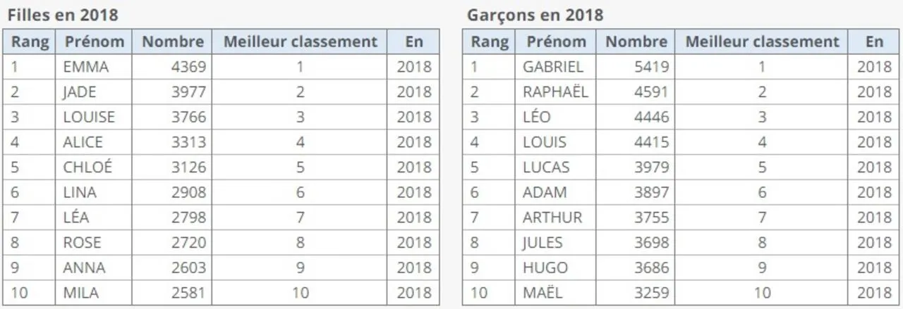 Emma, Gabriel, Louise, Hugo, Léa… Si le palmarès reste semblable à celui de l’année 2017, quelques prénoms, comme Maël et Anna, ont fait leur entrée dans le top 10. À noter : Jules dégringole de la quatrième à la neuvième place.